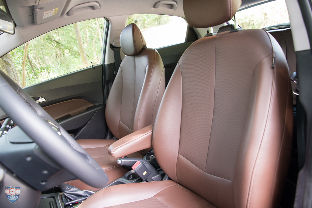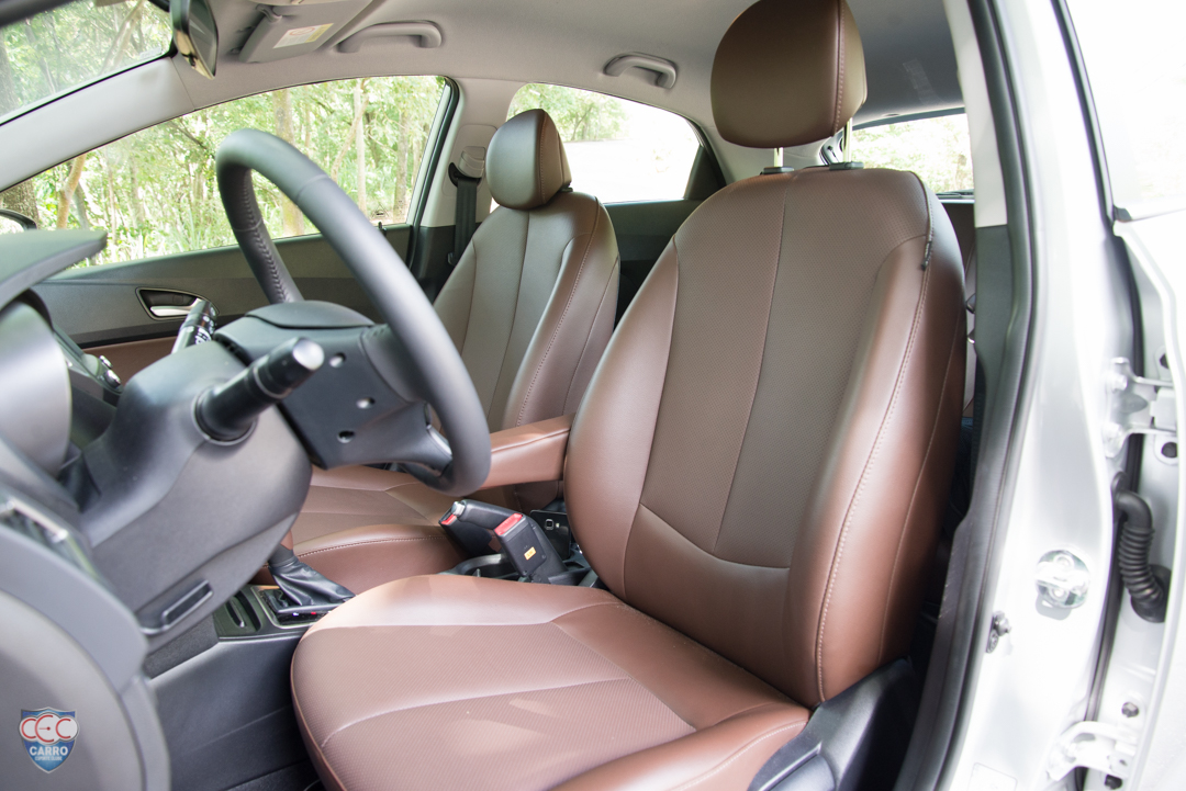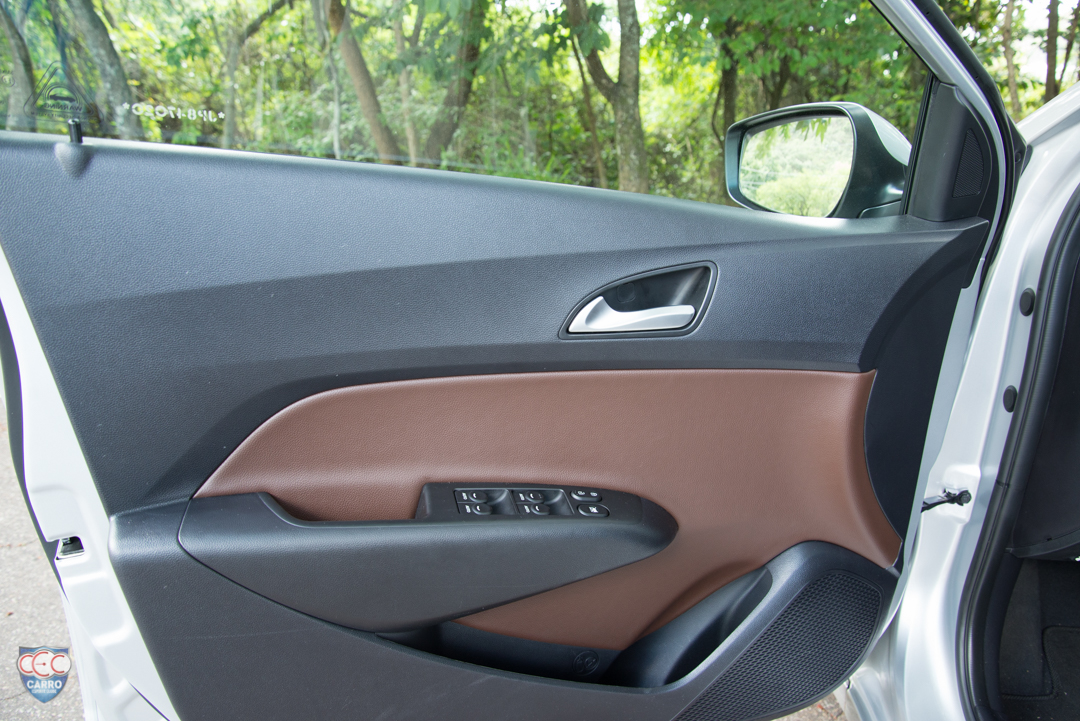 Na versão que aparece nas fotos, a Premium, o HB20 tem bancos de couro marrom. Positivo pelo lado da exclusividade, mas penso que pode ficar enjoativo no longo prazo. No console central, uma tampa móvel cobre o porta-trecos. Um recurso barato que mais carros dessa categoria deveriam ter.