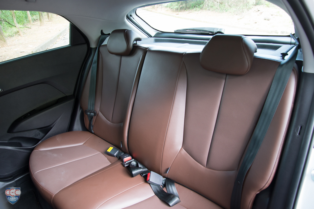 Por falar no assento traseiro, o Hyundai HB20 Premium 2019 oferece dois pontos de fixação Isofix com top theater. Porém comete uma falta grave: o passageiro do meio não possui encosto de cabeça, nem cinto de três pontos!